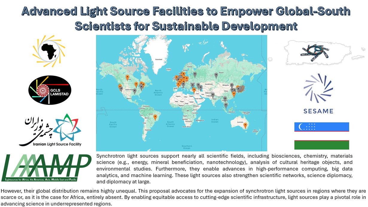 In conclusion, establishing major scientific infrastructure in the Global South is not only a matter of fairness or equity—it is a strategic investment in knowledge, capacity, and development. Intermediate actions, such as training programs or access to a limited number of beamlines abroad, are useful but insufficient. Only through long-term planning, regional cooperation, and broad international support can we create the conditions for transformative scientific capacity, which will benefit not only the regions directly involved but the global scientific community as a whole. The time to act is now, and the vision must be ambitious, inclusive, and forward-looking.
